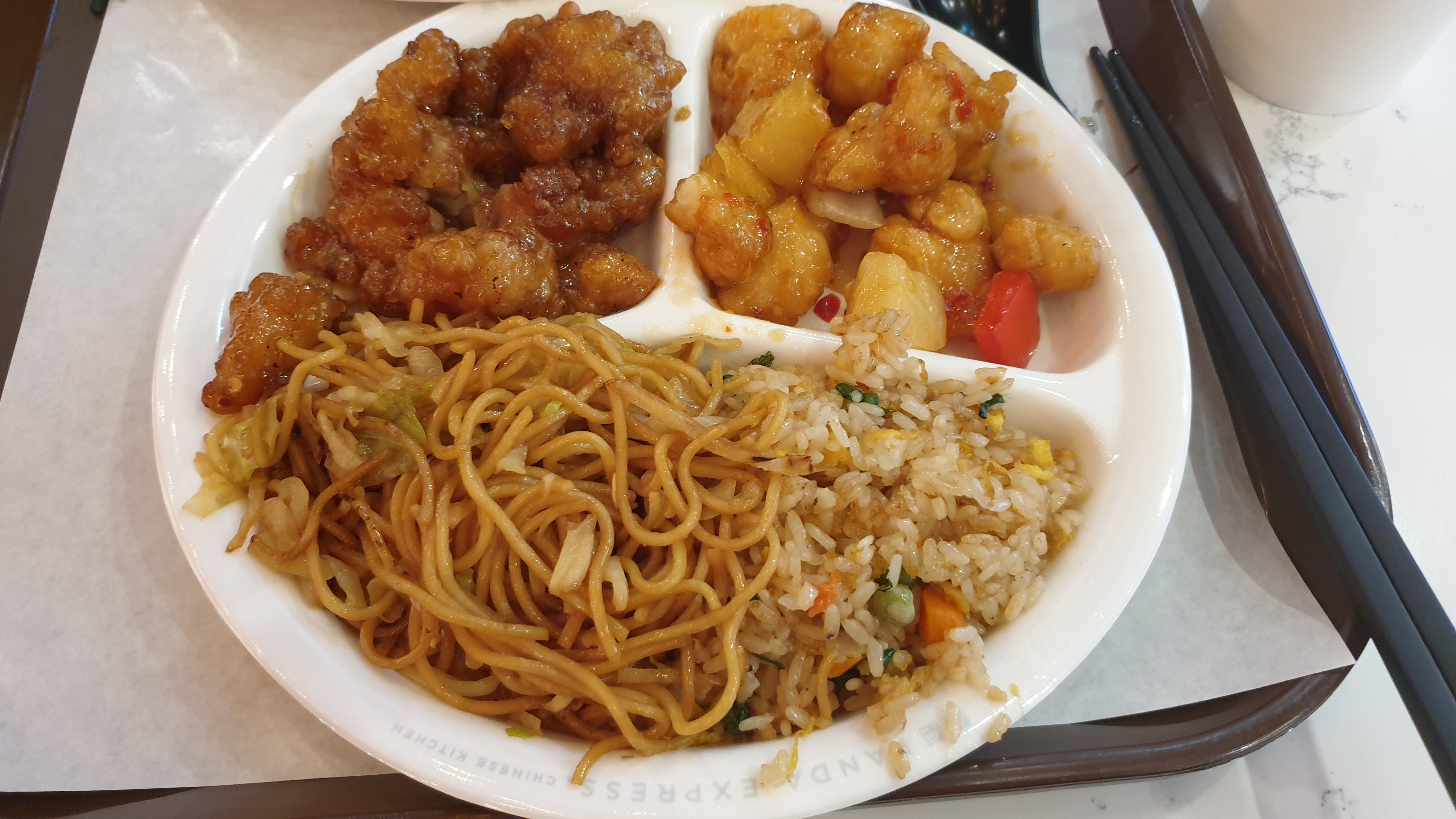 오렌지 치킨이랑 스윗 칠리 치킨 그리고 베이스 메뉴 반반 차우면과 볶음밥이다.